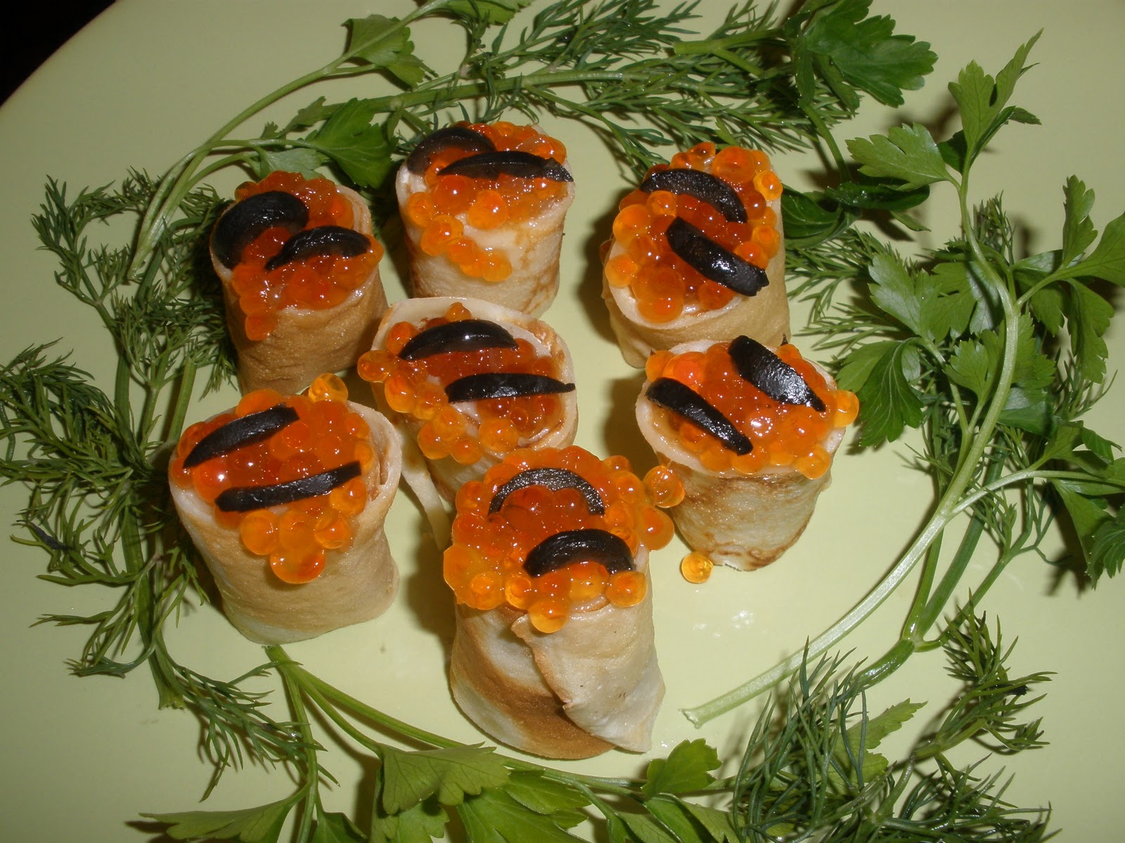 Рулетик режем на 4 части, сверху укладываем икру. Украшаем полосочками из маслин!